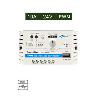شارژکنترلر خورشیدی مدل LS1024EU یک شارژکنترلر PWM میباشد که برای ماکزیمم 10 آمپر جریان شارژ در سیستمهای 12 و 24 ولت مناسب است. این شارژکنترلر فاقد صفحه نمایش بوده و تنها دارای نشانگر LED است که ظرفیت باتری و همچنین وضعیت شارژ پنل خورشیدی را نمایش میدهد. با استفاده از تنها دکمه قرار گرفته روی این دستگاه، میتوان علاوه بر قطع و وصل خروجی، نوع باتری را مشخص نمود.