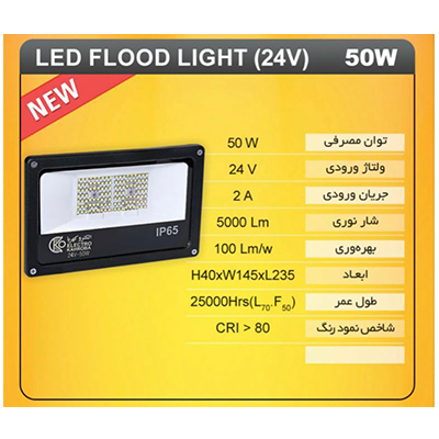 پروژکتور 50 وات، 24 ولت دارای قابلیت کار با برق مستقیم 12 ولت است که دارای نوردهی و کیفیت بالایی است.